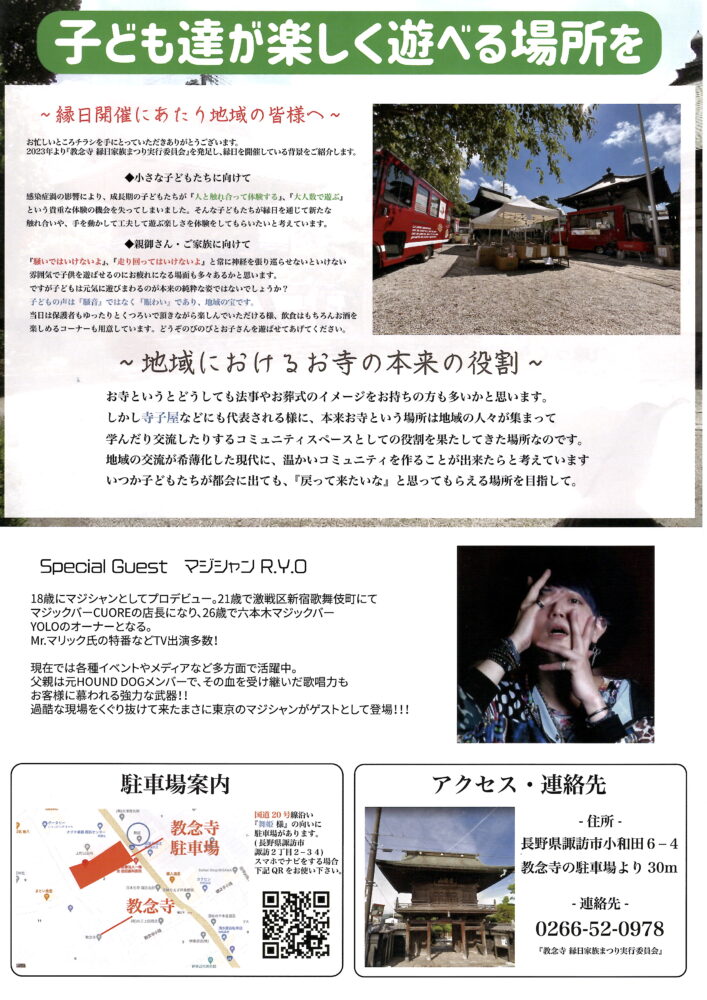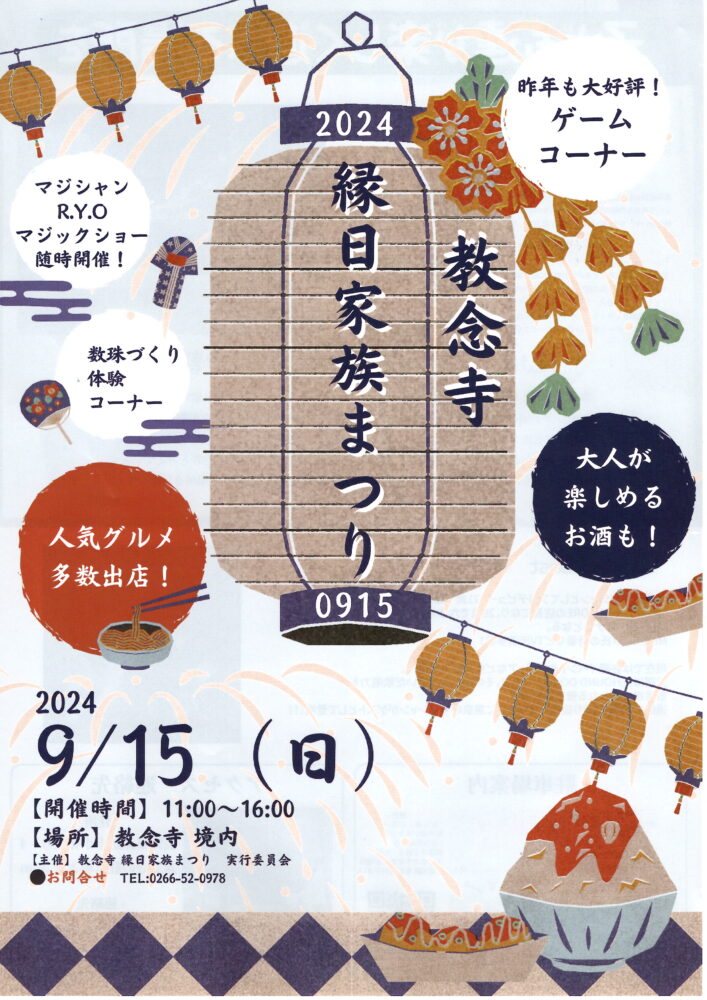 お知らせ ホームお知らせ9月15日縁日家族祭りのお知らせ 9月15日縁日家族祭りのお知らせ 2024-08-30 9月15日(日)に、縁日家族祭りを教念寺にて行います。 どなたでもご参加いただけますので、是非ご参加ください。 【開催時間】11:00~16:00 【場所】教念寺境内 詳細は下記のチラシをご覧ください。 前の記事 次の記事 新着情報一覧へ