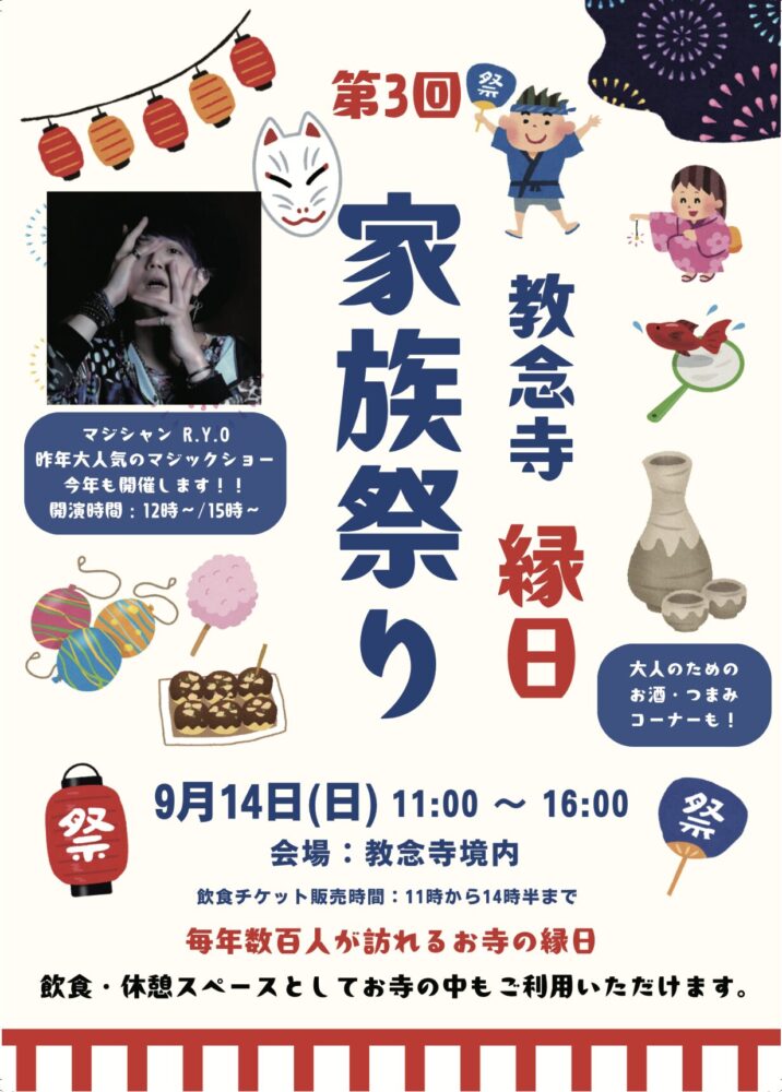 お知らせ ホームお知らせ新着情報9月14日縁日家族祭りのお知らせ 9月14日縁日家族祭りのお知らせ 2025-09-01 9月15日(日)に、縁日家族祭りを教念寺にて行います。 どなたでもご参加いただけますので、是非ご参加ください。 【開催時間】11:00~16:00 【場所】教念寺境内 詳細は下記のチラシをご覧ください。 前の記事 新着情報一覧へ